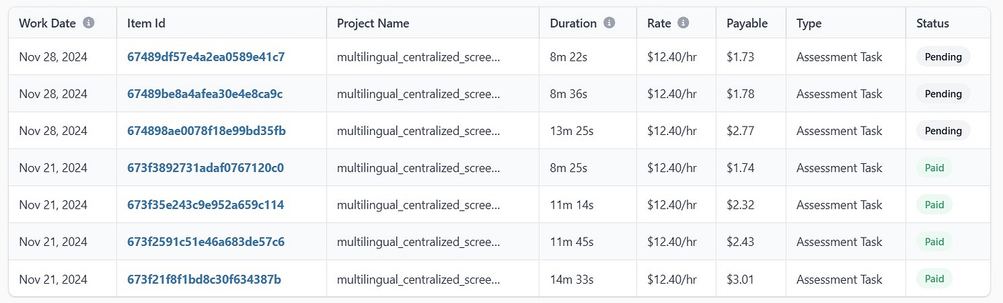 Ora passiamo in rassegna i vari job disponibili, ma non possiamo garantire che le definizioni non cambino o si confondano, ogni piattaforma ha la sua nomenclatura e una cosa che è “training” in un sito è “annotation” in un altro. Ma poco cambia: sempre operazioni di valutazione di risultati, scrittura di prompt o controllo qualità si tratta - o cose più complesse in ambito coding & C.
