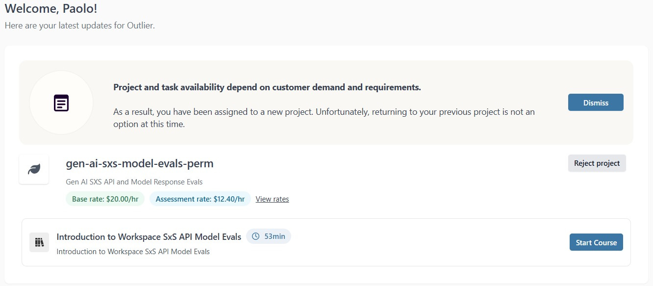Prima di tutto, attenzione a farsi delle idee troppo positive sui guadagni. I progetti vengono infatti allocati in modo imprevedibile e incontrollabile – dovete pensarvi come dei rider (quelli del cibo a domicilio) della tastiera - e si può restare giorni o settimane senza “task”. Meglio dunque pensare di usarli per arrotondare e soprattutto per imparare “da dentro” come funzionano i sistemi, cosa davvero senza prezzo per chi pensa di fare cose con l’AI in futuro. In secondo luogo, bisogna prepararsi ad esercitare alcune soft skill. Tra esse senz’altro le capacità di comunicazione in lingua inglese (anche se eseguite task in italiano), l’adattamento a situazioni diverse (cambiamento di task eccetera) e gestione del tempo – tutto viene misurato al secondo. Sotto, una schermata della nostra posizione oggi su Outlier: nessun task da fare, ma possiamo intanto formarci - e veniamo pagati.